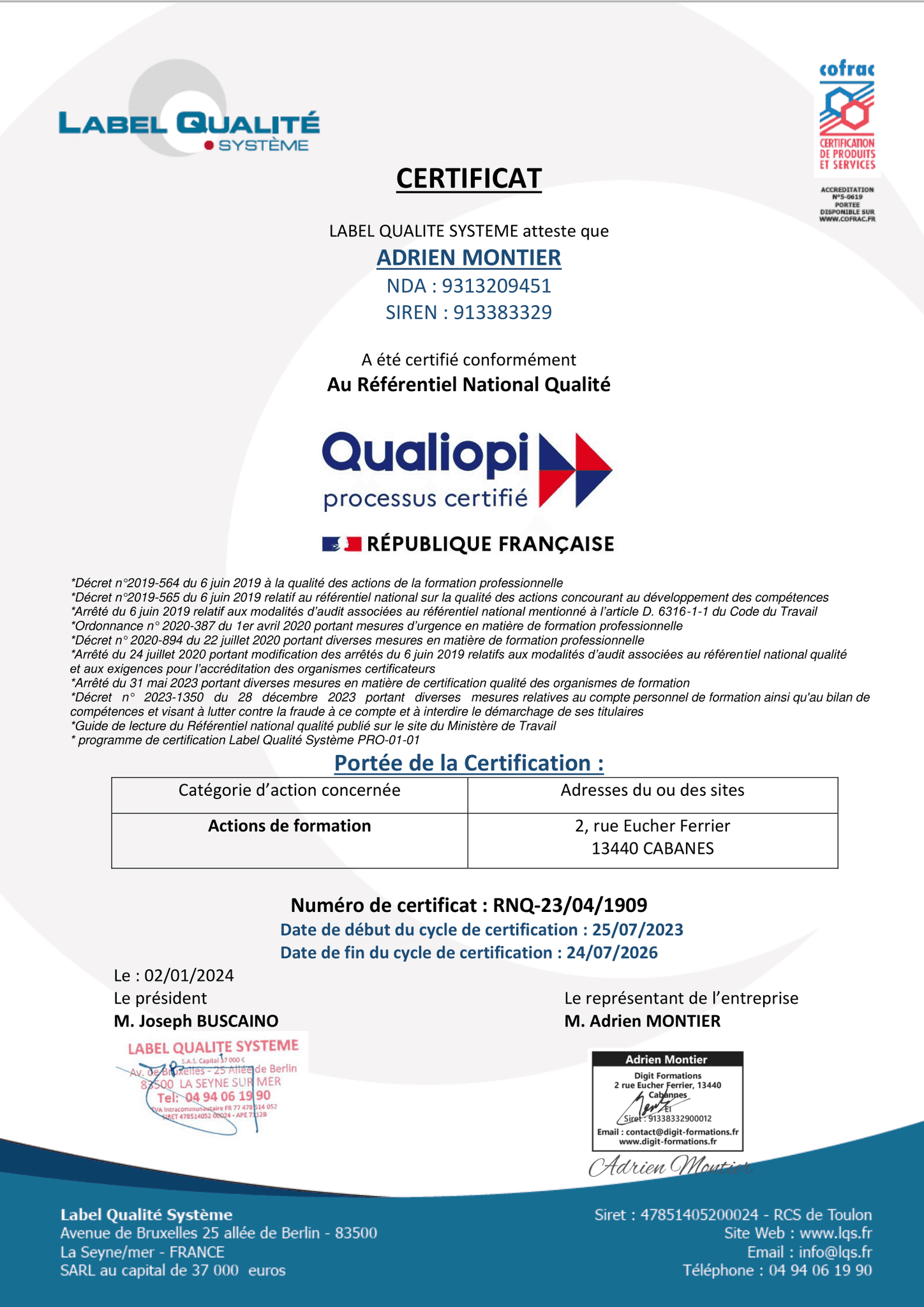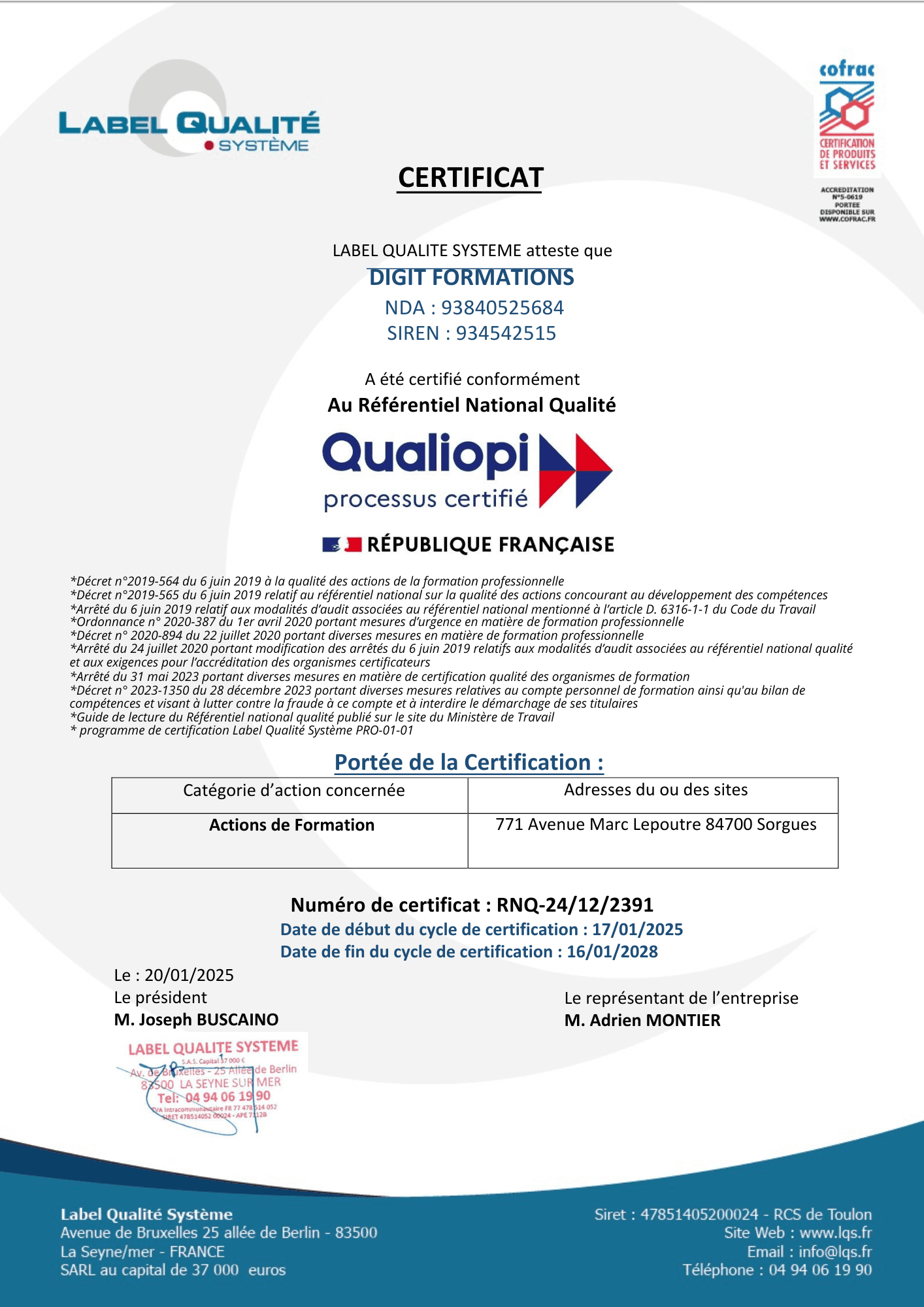 Informations légalesLe site Digit Formations est édité par la société Adrien Montier (siret : 91338332900012) dont le siège social est situé à l'adresse suivante : 2 rue Eucher Ferrier 13440 Cabannes.